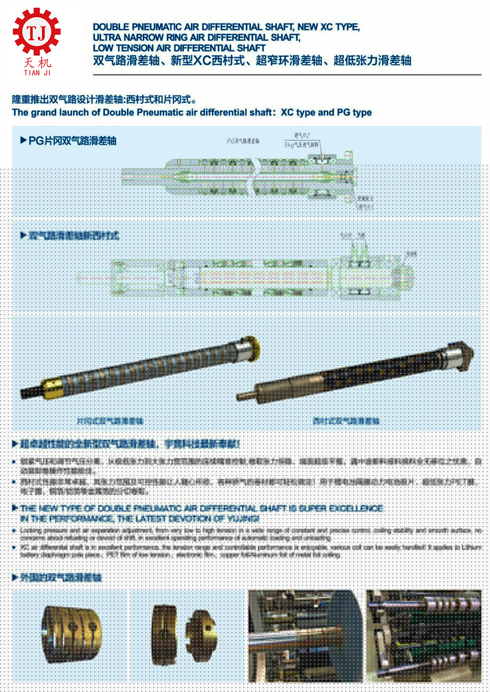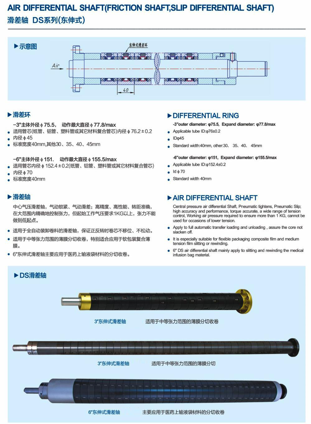 滑差式氣脹軸主要用于分條產(chǎn)品質(zhì)量要求比較高、速度比較快的分條設(shè)備。氣漲軸特殊分段,獨立打滑及扭力設(shè)定結(jié)構(gòu),它將能解決分條每一卷材料因厚薄及張力不均所造成的脫卷現(xiàn)象,能有效提高產(chǎn)品質(zhì)量及工效。