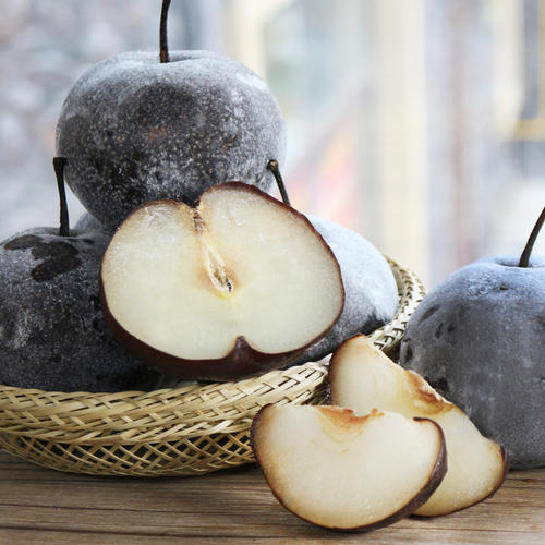 北方凍梨是寒冬贈(zèng)與的甜品。把新鮮的梨子隨手放在氣溫最低能達(dá)到零下三四十度的室外凍上一夜,經(jīng)過(guò)一夜的“雪打風(fēng)吹”裹著一層霜雪的凍梨就做好了。想吃?xún)隼娴臅r(shí)候,把凍的像石頭一樣的梨子在室溫下用涼開(kāi)水浸泡解凍半小時(shí),這時(shí)梨子的表面就會(huì)結(jié)出一層薄冰,掰開(kāi)冰膜,一口咬下,整個(gè)口腔瞬間“透心涼,心飛揚(yáng)”,而這凍梨也是暖氣房里“潤(rùn)燥”的佳品。